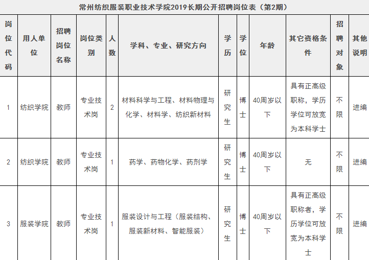 2、本次公开招聘不设开考比例,如有满足条件人员应聘,即可根据需要组织考核,以常州纺织服装职业技术学院通知为准;