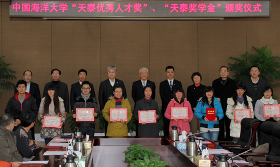自从1995年和1998年天泰集团出资200万在中国海洋大学分别设立“天泰奖学金”和“天泰优秀人才奖”以来,每年拿出10万元用于帮助那些品学兼优家境贫寒的学生顺利完成学业和奖励那些在教学和科学研究、现代化管理等领域取得突出成就的中青年教师。此次评奖,全校共有18名老师和25名学生获奖。自设奖以来,我院耿美玉、李英霞、于广利、朱伟明、李延团、赵峡、李静、邵长伦、李德海等老师获得“天泰优秀人才奖”,自07年以来,我院学生高群、张朝晖、马红光、李永春、王珊珊等获得“天泰奖学金”,基本保持了每年均有学生获奖。