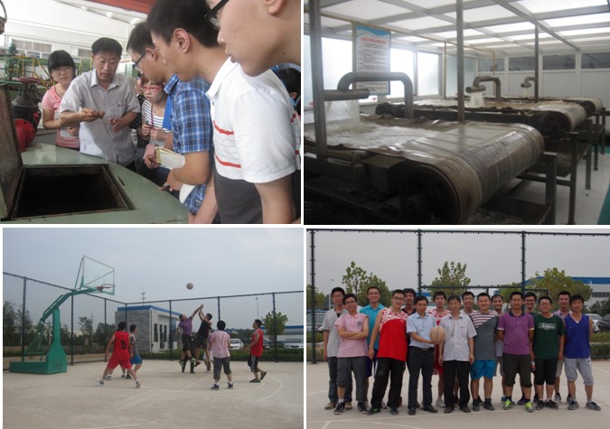 崔总亲切地给同学讲解生产工艺问题(左上图)、海藻酸钠生产工艺流程之——“过滤”(右上图)、双方队员激情对战(左下图)、双方队员合影(右下图)