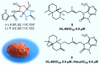 课题组在对我国西沙群岛海绵功能分子的研究中持续获得新颖结构功能分子。Agelas属(群海绵科Agelasidae)海绵为世界广布种,其中富含结构多样的活性生物碱类功能分子,咪唑和labdane二萜生物碱是其代表性次级代谢产物。近期,课题组首次从我国西沙群岛发现并采集到的一种近似种Agelasaff. Nemoechinata中,发现了一批新颖结构功能分子,包括1对含有环戊烷骈咪唑独特片段的新骨架生物碱(1),以及系列labdane二萜生物碱,其中二萜生物碱8和9表现出较好的抗肿瘤作用。研究结果显示出西沙海绵的化学多样性和生境特异性。