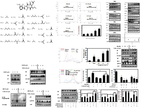 宫颈癌是严重危害妇女健康的恶性肿瘤之一,E6/E7为主要的致癌蛋白,是治疗宫颈癌的潜在药物靶点。我院分子药理实验室在对海洋链霉菌来源的一系列抗霉素类化合物的活性筛选中发现,以NADA为代表的该类化合物对E6/E7阳性的HeLa、CaSki、Siha等人宫颈腺癌细胞均具显著的抑制作用。对其分子机制研究发现,这类化合物通过激活活性氧(ROS)介导的泛素-蛋白酶体系统(UPS),进而促进E6/E7蛋白的降解。本研究揭示了该类化合物的新型生物活性及作用机制,是开发新型抗宫颈癌药物的良好先导化合物。