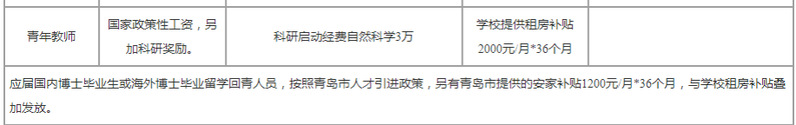 6.青年教师:提供科研启动费80万元,提供住房补贴2000元/月,共计三年。具有博士学位者,青岛市发放租房补贴1200元/月,共计三年。