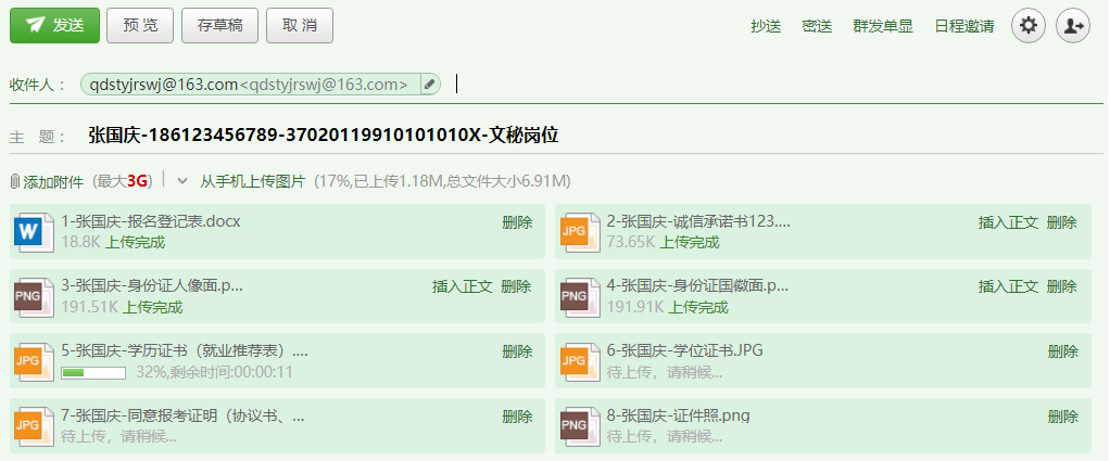 每名考生仅限报一个职位。考生下载并按要求填写《报名登记表》(附件2)、《诚信承诺书》(附件3),将《报名登记表》电子版和《诚信承诺书》(个人签名后扫描),有效期内二代身份证正反面(国徽面和人像面)、学历证、学位证照片或扫描件,职位要求的资格证书,工作单位、定向、委培单位同意报考及证明相关工作经历的证明(或无业证明),近期免冠证件照片发送到指定电子信箱(qdstyjrswj@163.com),邮件主题统一按照“姓名-手机号-身份证号-报考职位”格式命名,邮件大小控制在2MB以内(超过2M的邮件将不予通过审核),各项材料命名格式参考下图: