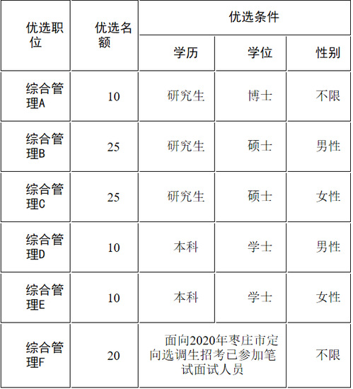 优选引进青年人才的范围为国内高校取得全日制研究生学历、博士学位(以下简称博士),取得全日制研究生学历、硕士学位(以下简称硕士)和部分国内重点高校取得全日制本科学历、学士学位(以下简称本科生)的人员(高校名单见附件1)。2020年枣庄市计划优选青年人才100名左右,其中,博士10名、硕士50名、本科生20名、2020年枣庄市定向选调生招考已参加笔试面试人员20名,可根据报名、面试和考察情况,适当增减引进计划。具体职位如下: