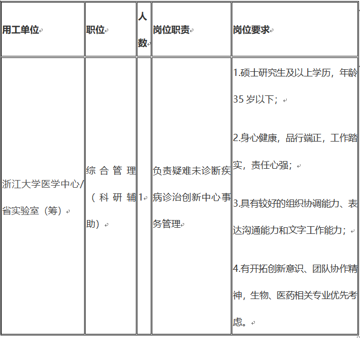 本单位拟公开招聘科研辅助人员1名,派遣至浙江大学医学中心系统医学与精准诊治浙江省实验室(筹)从事相关岗位工作。招聘将坚持公开、公平、竞争、择优的原则,凡符合招聘岗位要求且有意向者,请将个人简历(包括学习、工作和研究经历)以及其它证明本人能力、水平的相关资料发至liuyangly@zju.edu.cn邮箱。经考核后择优录取、待遇面议,工作表现优秀者有机会获得更好地职业发展通道。具体招聘岗位及要求详见附件。