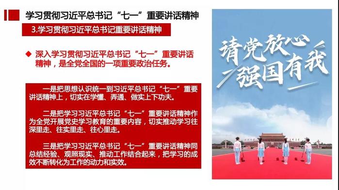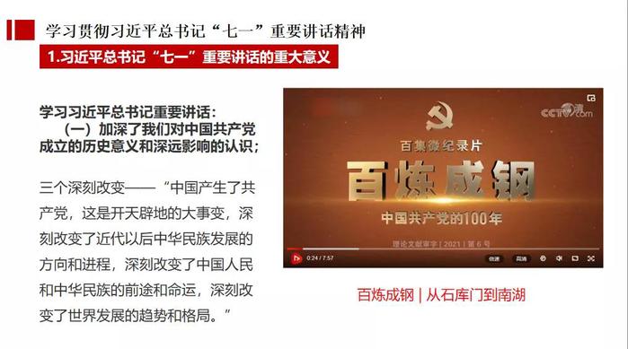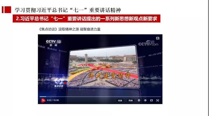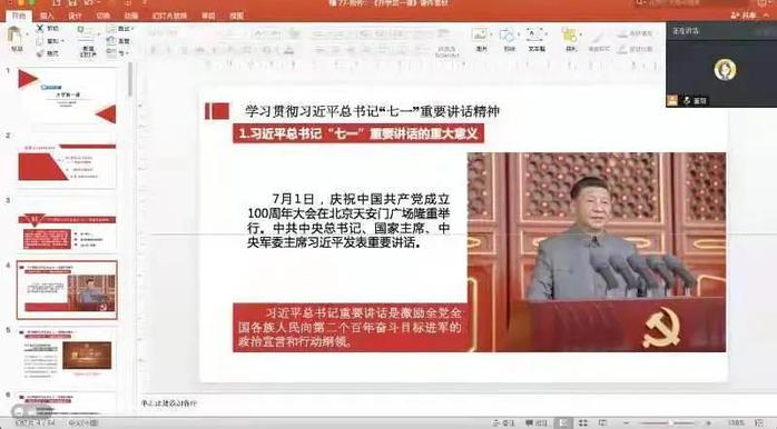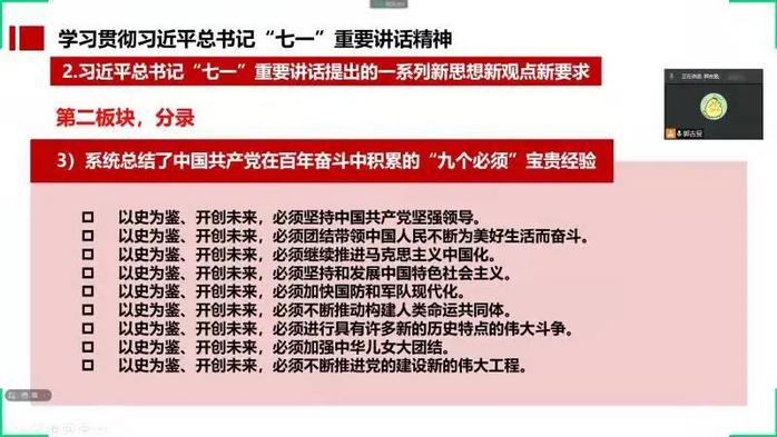 其次,几位老师又讲述了习近平总书记“七一”重要讲话提出的一系列新思想新观点新要求。在总录中,习近平总书记庄严宣告了第一个百年奋斗目标已成功实现并首次提出了实现中华民族伟大复兴是贯穿中国共产党百年奋斗主题这一重大观点。在分录中,老师通过播放《汲取精神之源,凝聚奋进力量》《以史为鉴,开创未来》等视频让同学们能够更好理解伟大的建党精神,同时也了解了中国共产党未来的发展目标以及在百年奋斗中所积累的“九个必须”宝贵经验。