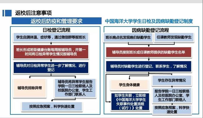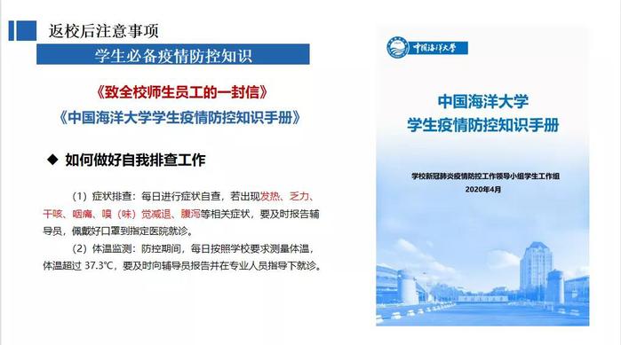 随后,同学们又集中学习了返校后注意事项,其中疫情防控是重点。老师们分别从如何做好自我排查、如何做好宿舍区防护工作、如何做好实验室防护工作、在教学区上课时应如何做好防护、食堂就餐时应如何做好防护、在其他公共场所(如超市等)如何做好防护这六个方面进行了详细的讲解,同时介绍了学生必备的疫情防控知识以及返校后防疫和管理要求,强调了要严格遵守日检及因病缺勤相关的登记制度,在出现异常情况时要主动采取措施,及时报告辅导员。