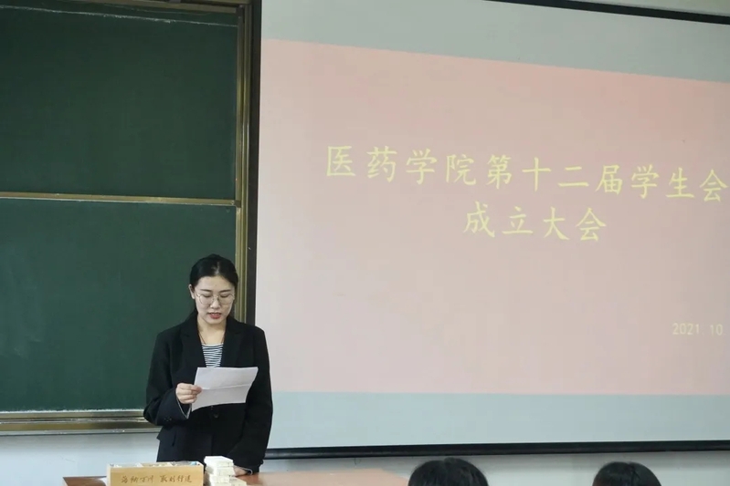 随后,干事代表李欣欣(2021级药学1班)进行发言。李欣欣回顾了自己入学一个多月以来的心路历程,并表达了自己服务同学、施展才能、提升自我的目标和期望。同时,她表示自己将以饱满的热情和严谨的态度对待学生会工作,在工作中不断学习、进步,丰盈自我。