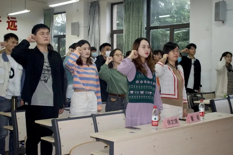 大会伊始,全体参会人员在方岫琴的带领下重温入团誓词。全体参会人员起立,紧握右拳,在团旗下庄严宣誓。誓言铮铮,掷地有声;目光炯炯,坚定如炬。他们的宣誓不仅是对党团的承诺,更是自我愈加坚定的信念,不断丰盈的思想,为学生、学院服务的决心。