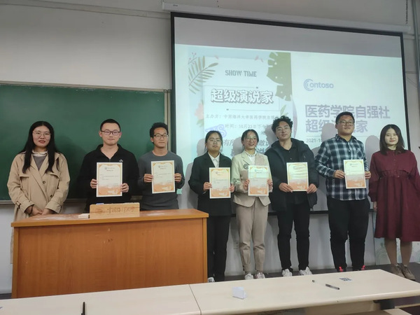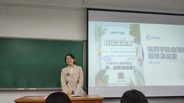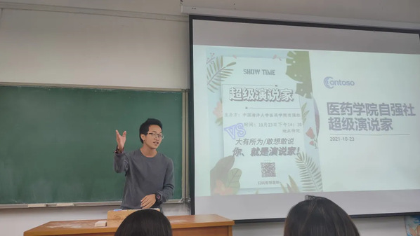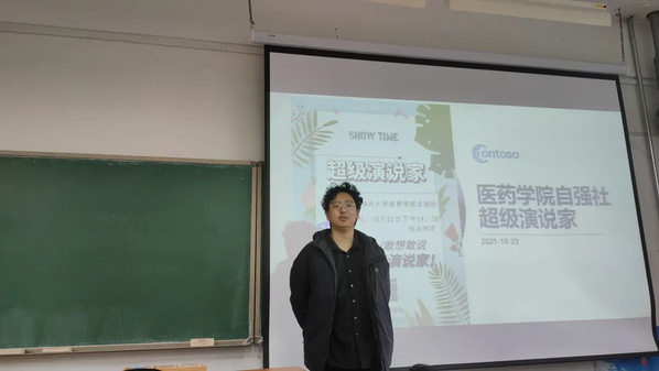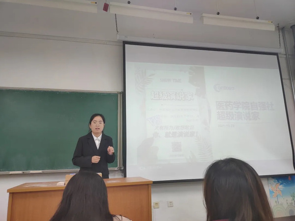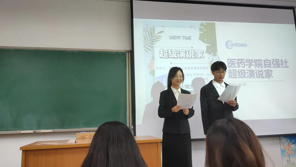 活动伊始,主持人杨金廷(2021级药学2班)和肖洽菲(2021级药学2班)致开幕词并宣读本次比赛的规则,即每名选手进行一分钟的风采展示和五分钟的主题演讲,随后由两位评审嘉宾进行点评和打分。