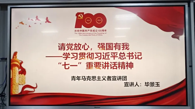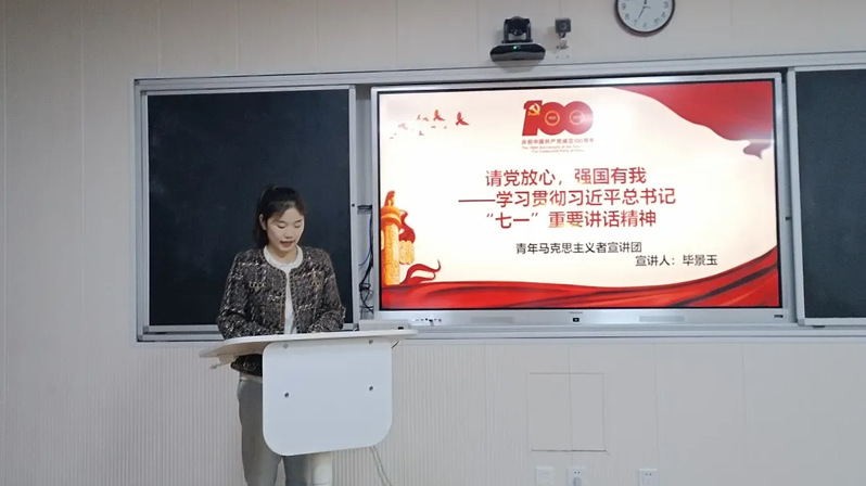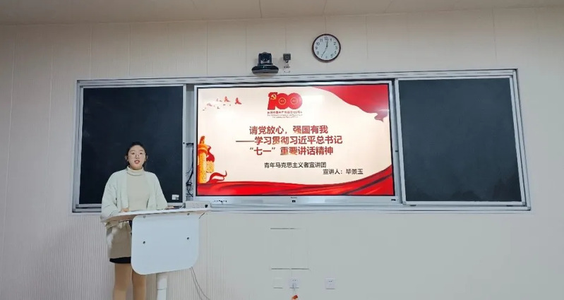 接下来,青年马克思主义者宣讲团成员毕景玉围绕“请党放心,强国有我——学习贯彻习近平总书记‘七一’重要讲话精神”主题,从以下五个方面展开宣讲。