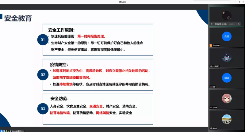 首先,徐文锋老师开展了安全教育。她详细介绍了威廉希尔学生实践团队成员须知。然后从严格遵守疫情防控要求和学校学生管理规定;保障自身健康安全,做好个人防护;创新形式,避免聚集三个方面讲解了安全教育内容。之后着重强调了安全工作原则、疫情防控、安全防范与每日上报的重要性。
